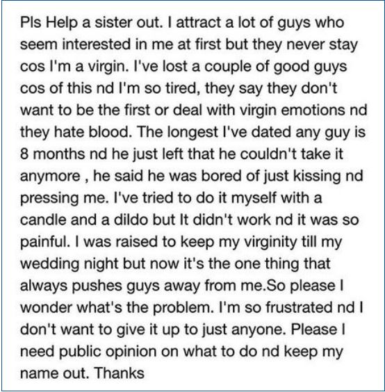A young lady who is currently a virgin at adulthood which has prevented her from keeping a relationship has cried out for help.